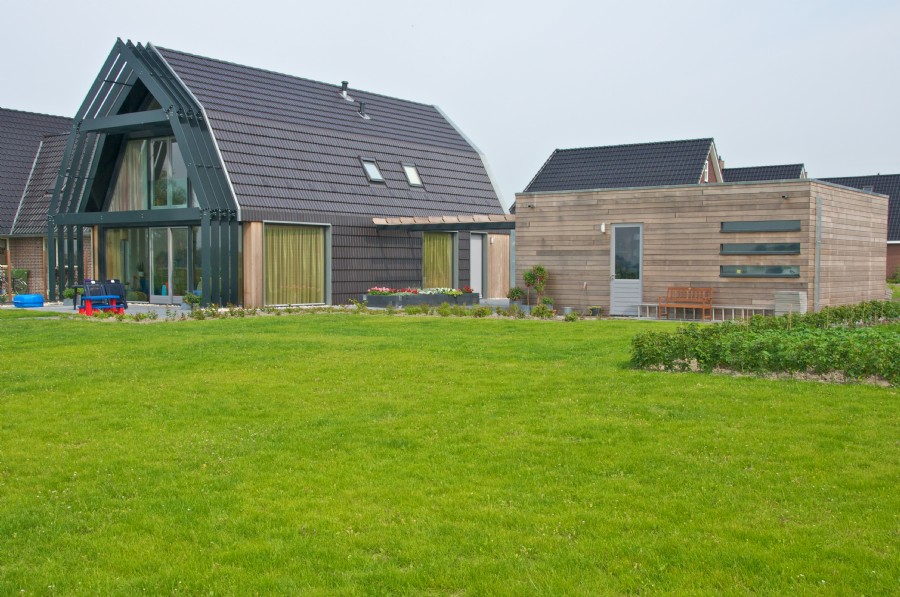 De woning is voorzien van een warmtepomp die, vanuit twee bronnen onder het erf, zorgt voor de vloerverwarming door aardwarmte. Er zijn panelen voor het ontvangen van elektriciteit, zowel tegen de oever van het slootje gelegd als op het dak van de garage/berging geplaatst. De rijen zonnepanelen liggen niet in zicht vanwege de verhoogde daklijsten. Dit geheel ten positieve van het aanzien. De woning is voorzien van een zogenaamde gebroken kap met uitwendige knikken, waardoor op de verdieping meer ruimte is gecreƫerd voor slaapkamers. De tuingevel aan de achterzijde is helemaal van glas om het zonlicht in de winter maximaal toe te laten. Voor de glasgevel zijn vier metalen spanten van vlakke lamellen geplaatst om de hoogstaande zomerzon wat te weren. De woning heeft een ingetogen hoofdvorm met een opmerkelijke detaillering.